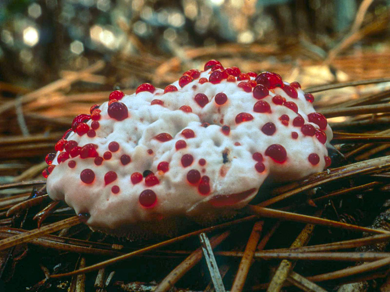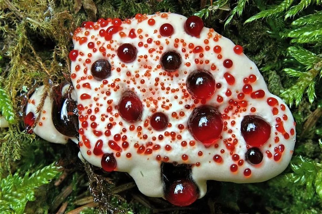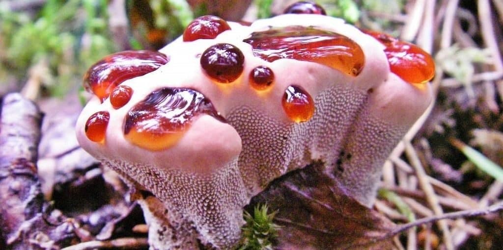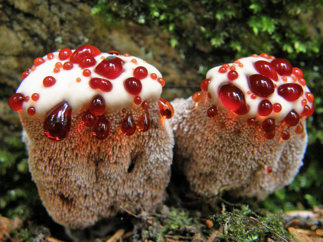 Необычен этот ежовик своим внешним видом. На светлой, почти белой поверхности гриба иногда выступают ярко-красные капли, и правда похожие на кровь. Из-за этого гриб получил несколько выразительных народных названий – «кровавый зуб», «зуб дьявола», «слезы ангела», а также «клубника со сливками». Но на самом деле, ничего особенно ужасного в ежовике Пека нет. Он даже не ядовит, хоть и не съедобен из-за сильно горького вкуса. Красные капли, которые время от времени появляются на этих грибах, имеют вполне прозаическую природу. При высокой влажности воздуха лишняя вода выделяется через специальные водяные железки на поверхности плодового тела гриба. Это явление называется гуттацией. Она характерна для многих грибов, растущих на древесине, ее можно часто наблюдать у трутовиков. Обычно эти капли прозрачные или желтоватые, они содержат минеральные соли и органические примеси. У ежовика кровоточащего красный цвет каплям придает клеточный сок, содержащий антикоагулянт атрометин… Алые капли на поверхности гриба сохраняются недолго, всего несколько часов, а без них гриб выглядит довольно заурядно.