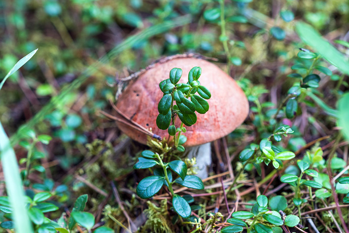 Листья брусники перед подосиновиком. Но брусника пока не спелая, да и ягод в этом году что-то очень мало.