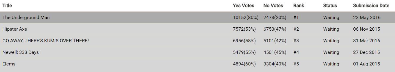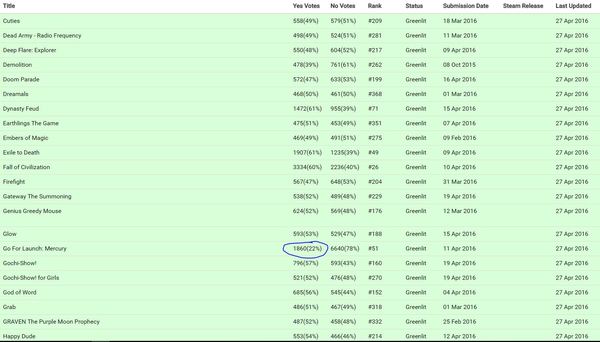 Во-вторых, хотя напрямую количество отрицательных голосов и не влияет на результат, но если у вас соотношени за и против будет в районе 20 процентов, выход из гринлайта может затянуться (хотя есть и исключения. см. скрин ниже). Но, вместе с тем, 40-50 процентов "за" считается вполне нормальным результатом.