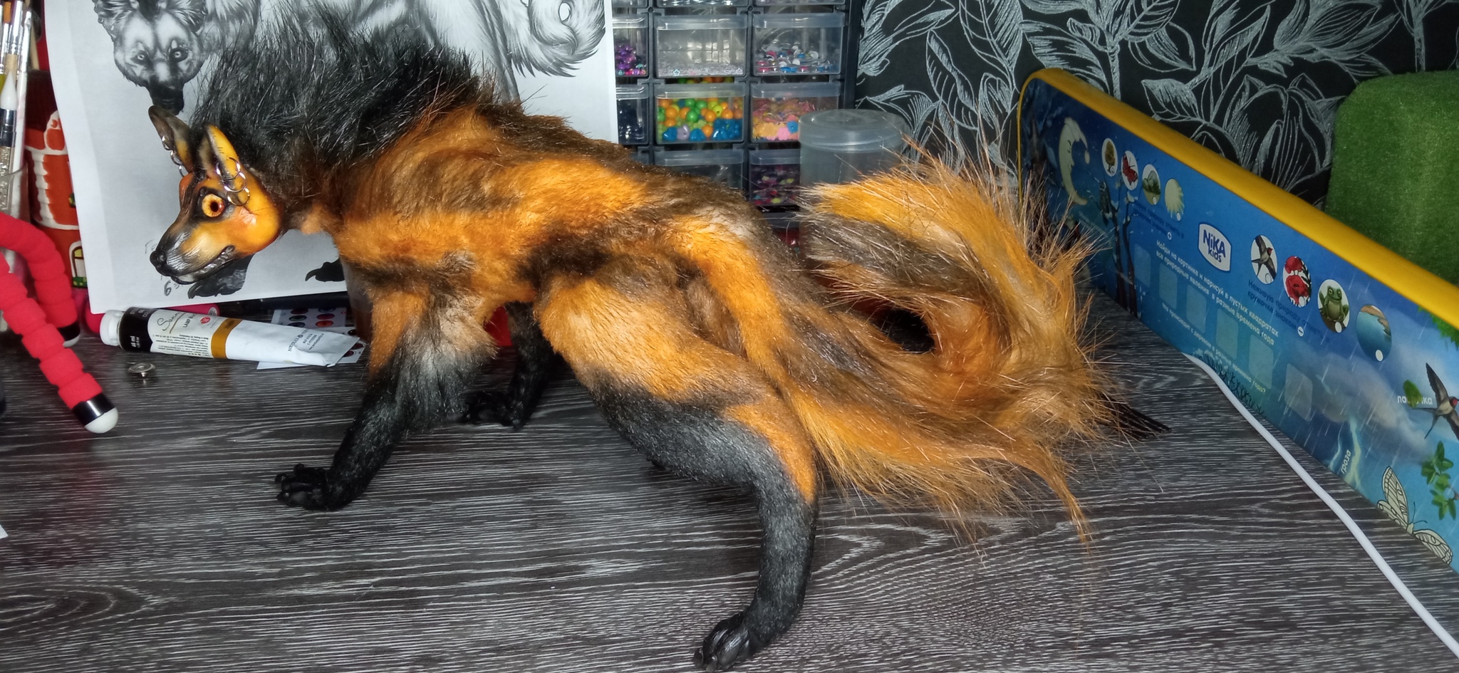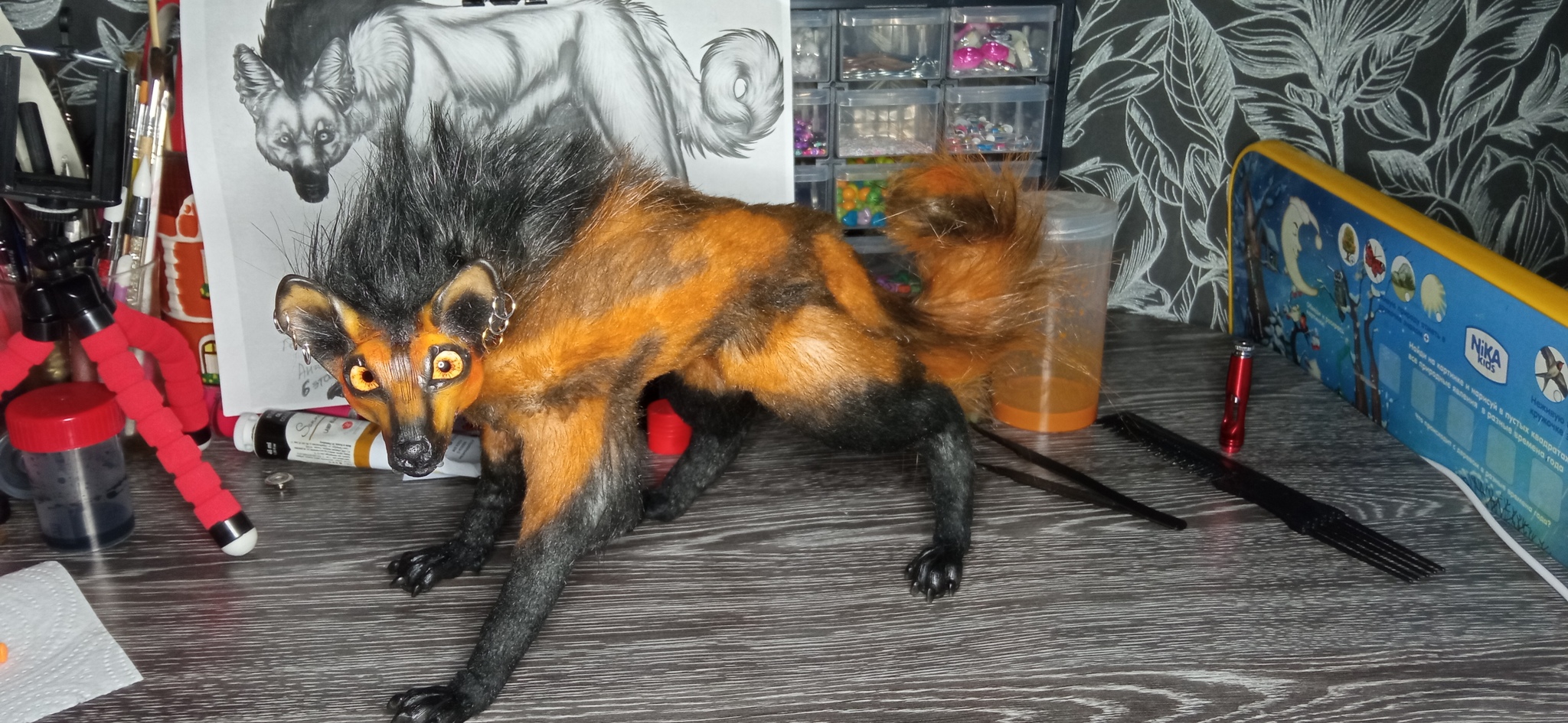Вот такой красавец получился 😍 Прототипом стал гривистый волк (на заднем плане на фото).😊 Сделан малыш на проволочном каркасе и обтянут искусственным мехом. Голова и лапки - полимерная глина, а глазки - стекло. Высота в холке 18см, а длина (от кончика носа до конца хвоста) 42см.