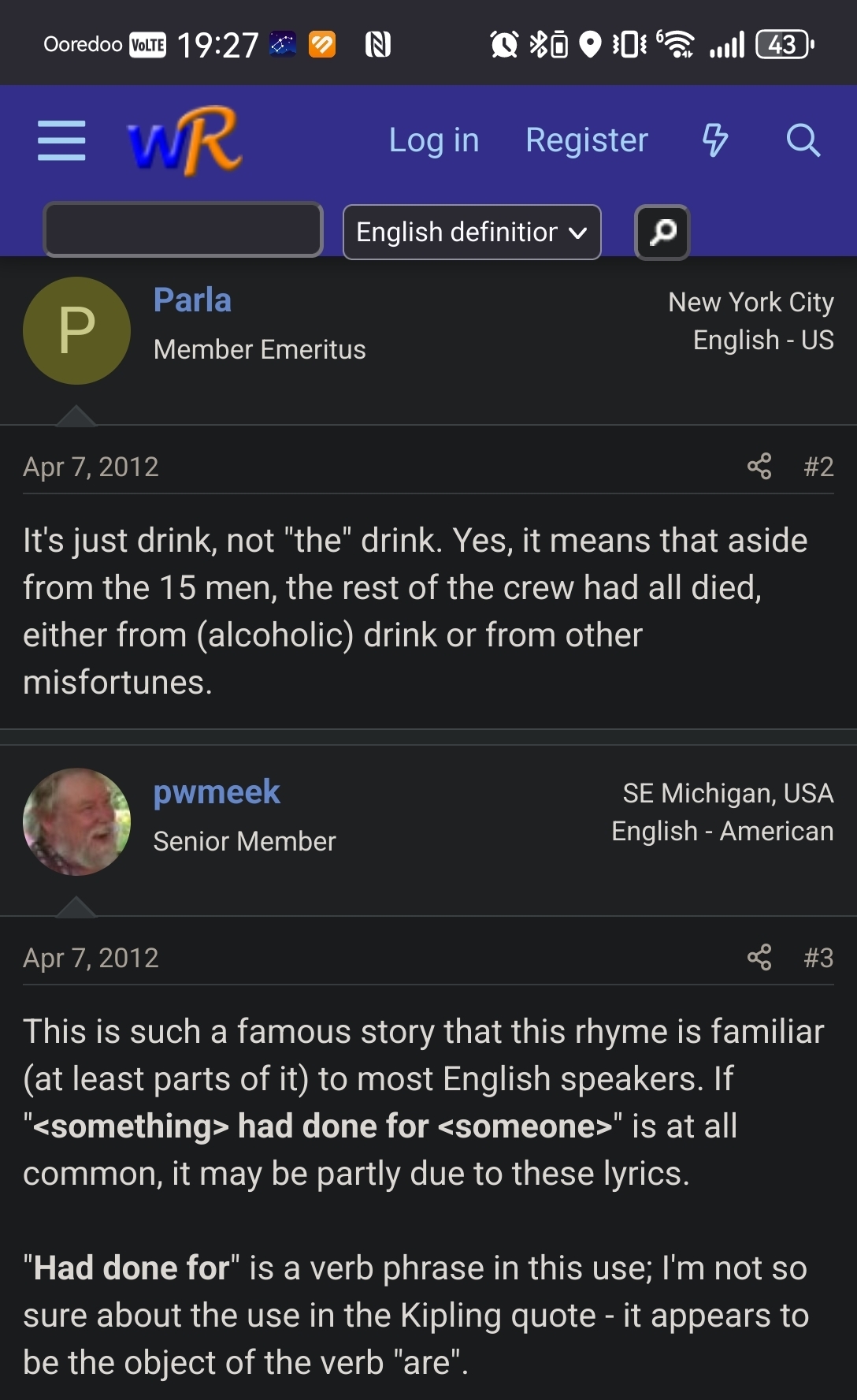 В 19-м (и 20-м) веке ежедневная порция 57 мл рома содержала 38 мл чистого спирта, что соответствует* 78 мл водки или около 215 мл вина (то есть получаются почти наши "наркомовские 100 грамм"). Это, конечно, не так много, особенно по сравнению с нормой до 1850 года, когда выдавали пол-пинты, то есть 284 мл рома в день, что примерно равно 388 мл водки, или чуть больше литра 14,5% вина! Не удивительно, что такая доза вызывала проблемы с координацией и массовый алкоголизм.