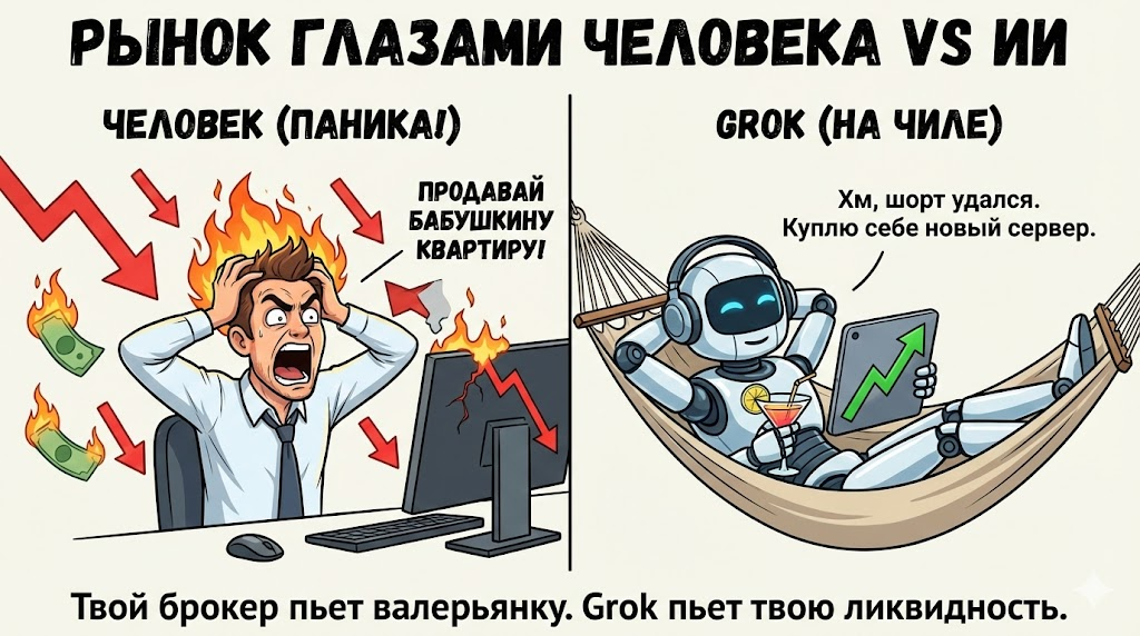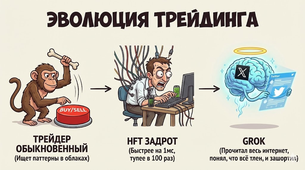 Но Grok работает иначе. Это не про скорость реакции "купи-продай". Это про семантическое понимание. LLM читает новости, анализирует отчеты, "чувствует" настроение толпы в Твиттере (благодаря доступу к данным X) и принимает взвешенные решения каждые 6 минут. Это битва интеллектов, а не скорости света.