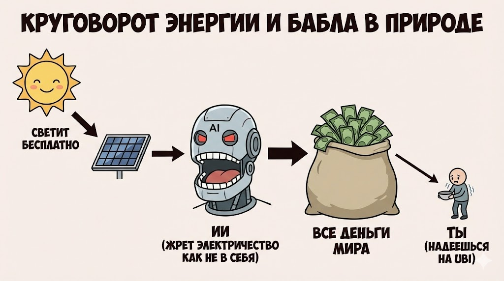 Мы стоим на пороге мира, где деньги будут зарабатывать машины, чтобы покупать электричество у других машин. А нам, людям, останется только наблюдать и надеяться на Безусловный Базовый Доход (UBI). Ну, или майнить картошку на даче.