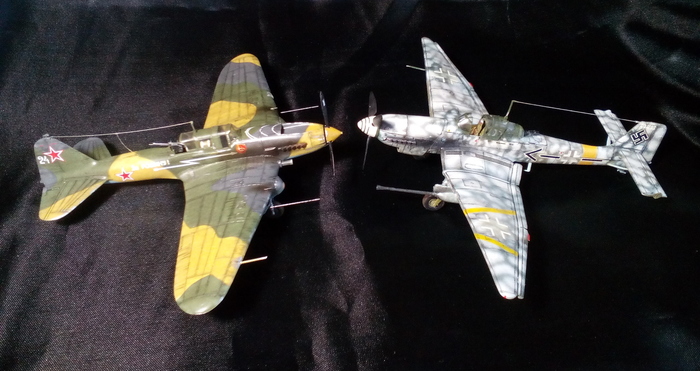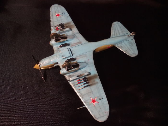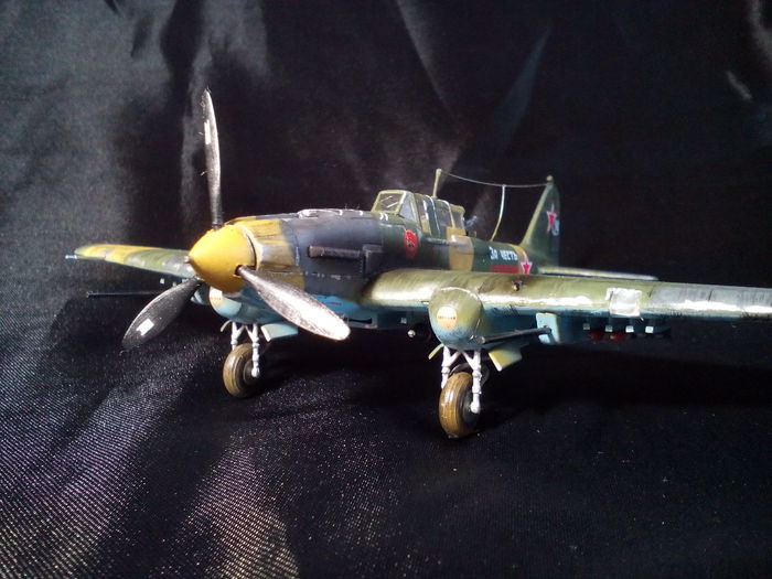 Штурмовик Ильюшин Ил-2 - самый массовый боевой самолёт в истории авиации, за годы серийного производства было выпущено 36 183 экземпляра, которые массово применялись на всех фронтах Великой Отечественной, а по её окончании состояли на вооружении ВВС СССР и стран-сателлитов до 1954 года. Разработан в ОКБ-240 под руководством С.В.Ильюшина, первый полёт совершил в октябре 1939. За время производства в конструкцию неоднократно вносились изменения, в том числе радикальные (кабина была одиночной или двухместной, изменялась форма крыльев, менялся двигатель). Конструктивно штурмовик представлял из себя классический низкоплан смешанной конструкции, характерной особенностью которого являлась интегрированная в силовую схему планера броня АБ-1 (позднее - АБ-2), состоявшая из листов гомогенной стали толщиной 4-6 мм. Бронирование защищало мотор и пилота (стрелка - в меньшей степени) от пуль и осколков снарядов, повышая живучесть самолёта. Способность Ил-2 держать удар и его надёжность впечатляют - были зафиксированы случаи, когда штурмовики возвращались на базу, имея более 500 пробоин. Немецкие военные прозвали Ил-2 Betonflugzeug - "Бетонный самолёт", так же за ним закрепилось прозвище "летающий танк".