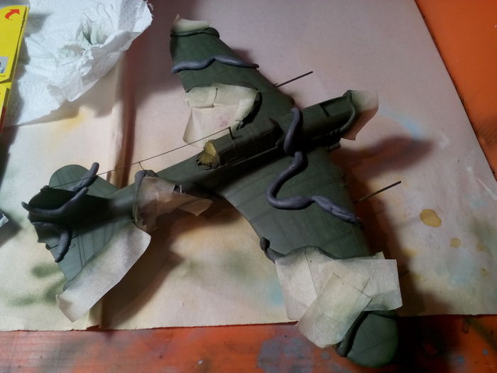 Далее - зелёный с его высветлением и маскировка. Маскировал, кстати, патафиксом и малярным скотчем.