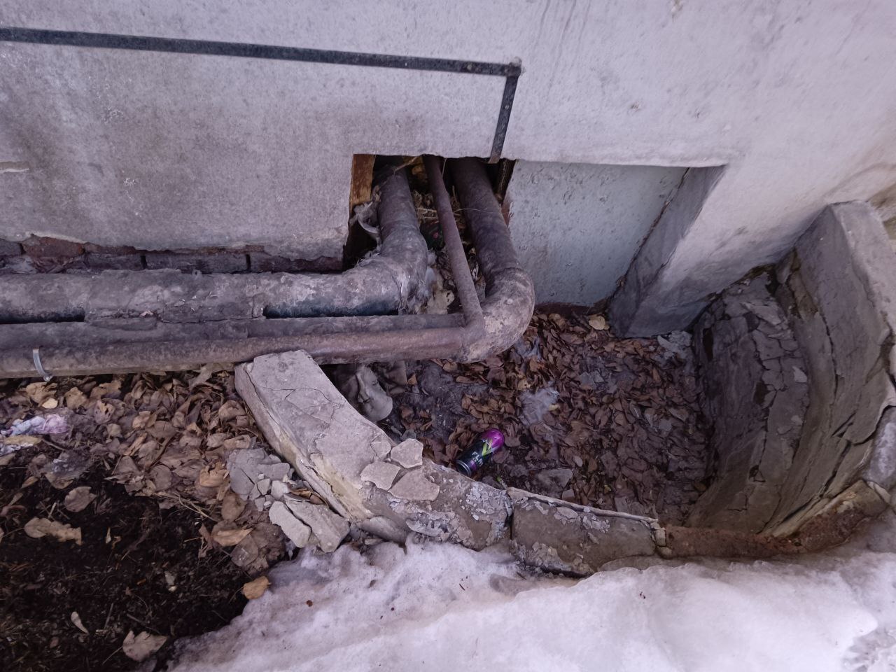 Труба из черного металла, вся в хомутах, без конца течет, а этой зимой даже было вот так: