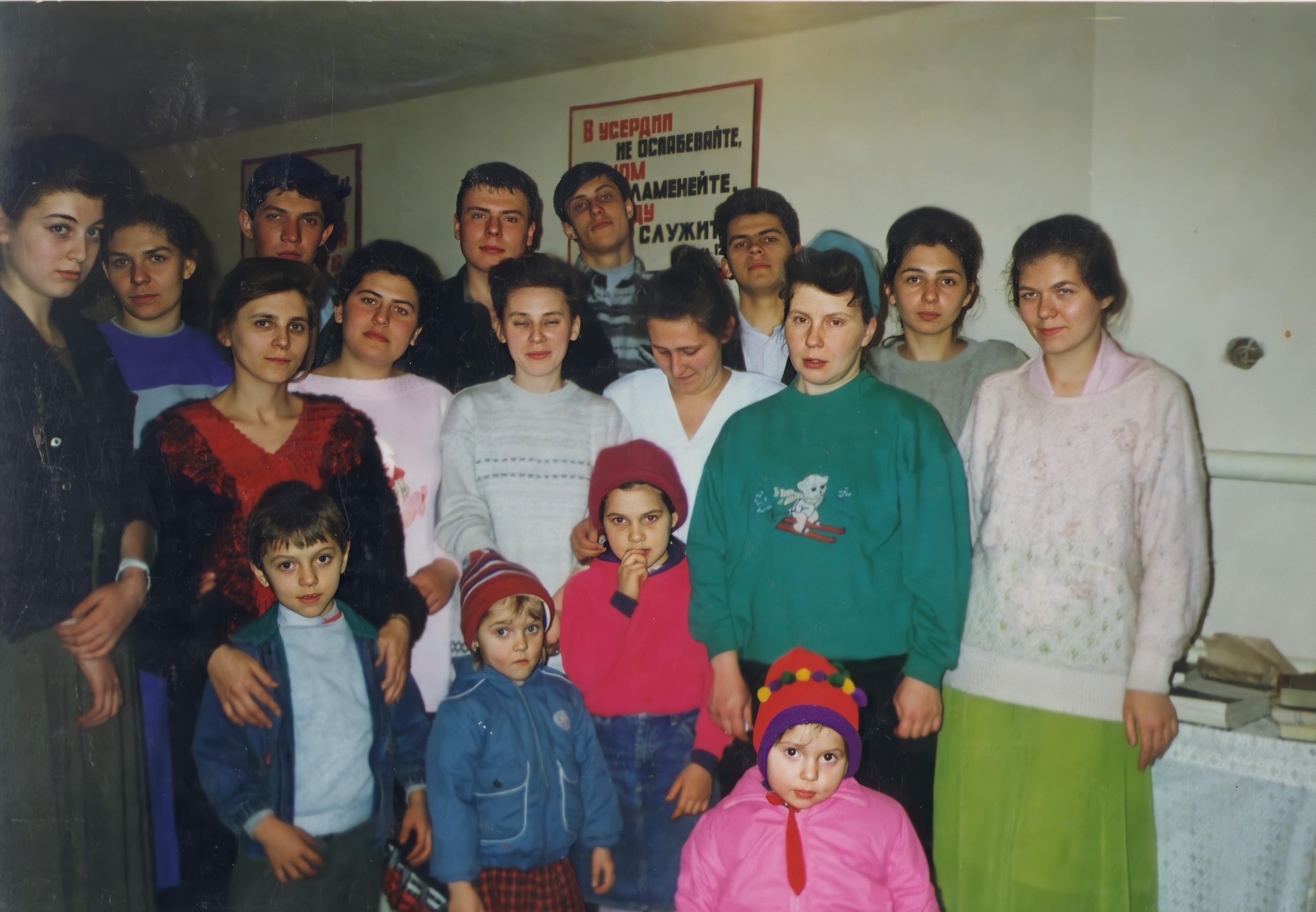 Моя старшая сестра решила побыстрей свалить из нашего инкубатора с постоянным аккомпанементом из матов отца и выскочила замуж. В 19 лет она уже родила. Вроде бы для второй это было хорошо. Но как оказалось до поры до времени. Третья сестра тоже вышла замуж и остались мы, вторая и четвертая одни с матерью и братом. День рождения близко по времени, праздновали вместе и подарки получали абсолютно одинаковые, чтоб не обидно было. Кстати, у нас не принято было делать день рождения просто из-за безденежья. Но потом, когда мы все начали ходить на собрание, уже верующие мою мать и старших сестер пристыдили и мы начали организовывать посиделки, "чтобы пригласить кого-то из родственников для благовестия им" Не как внимание к тому у кого день рождение. Фото после какого-то нашего дня рождения. Молодежь церкви Нарткалы. Как это обычно у баптистов водится - бабский батальон 8 незамужних сестер и 4 брата, один из них не местный.