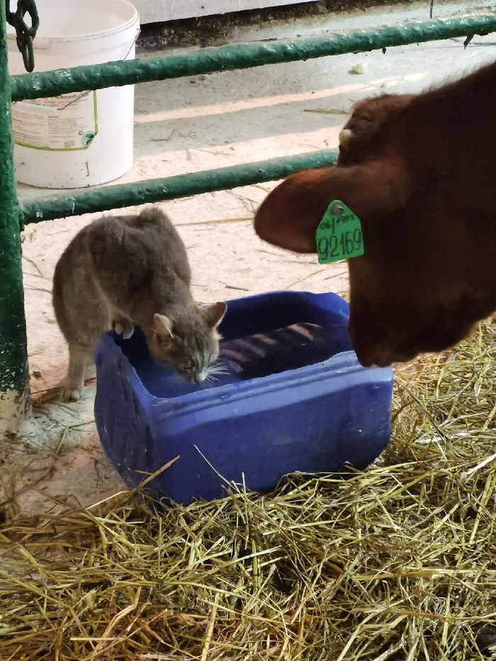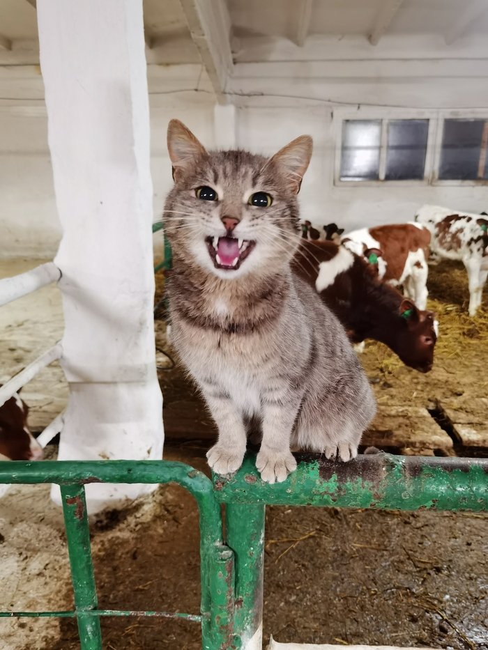Спустя время, двух котят решили забрать домой. Остался последний, серый мальчишка. Долго мое сердечко сопротивляться ему не могло, я неизбежно полюбила его и наградила именем "Котик". До чего же он был голодный до контакта с человеком, тёрся об ноги, любил компанию, а если гладить его некому – шел в клетку к телятам, чтобы окружить себя хотябы их лаской. Я не могла себе позволить столько времени и нежностей уделять ему, или забрать домой. По многим причинам. Но котик знал, что нужно делать.