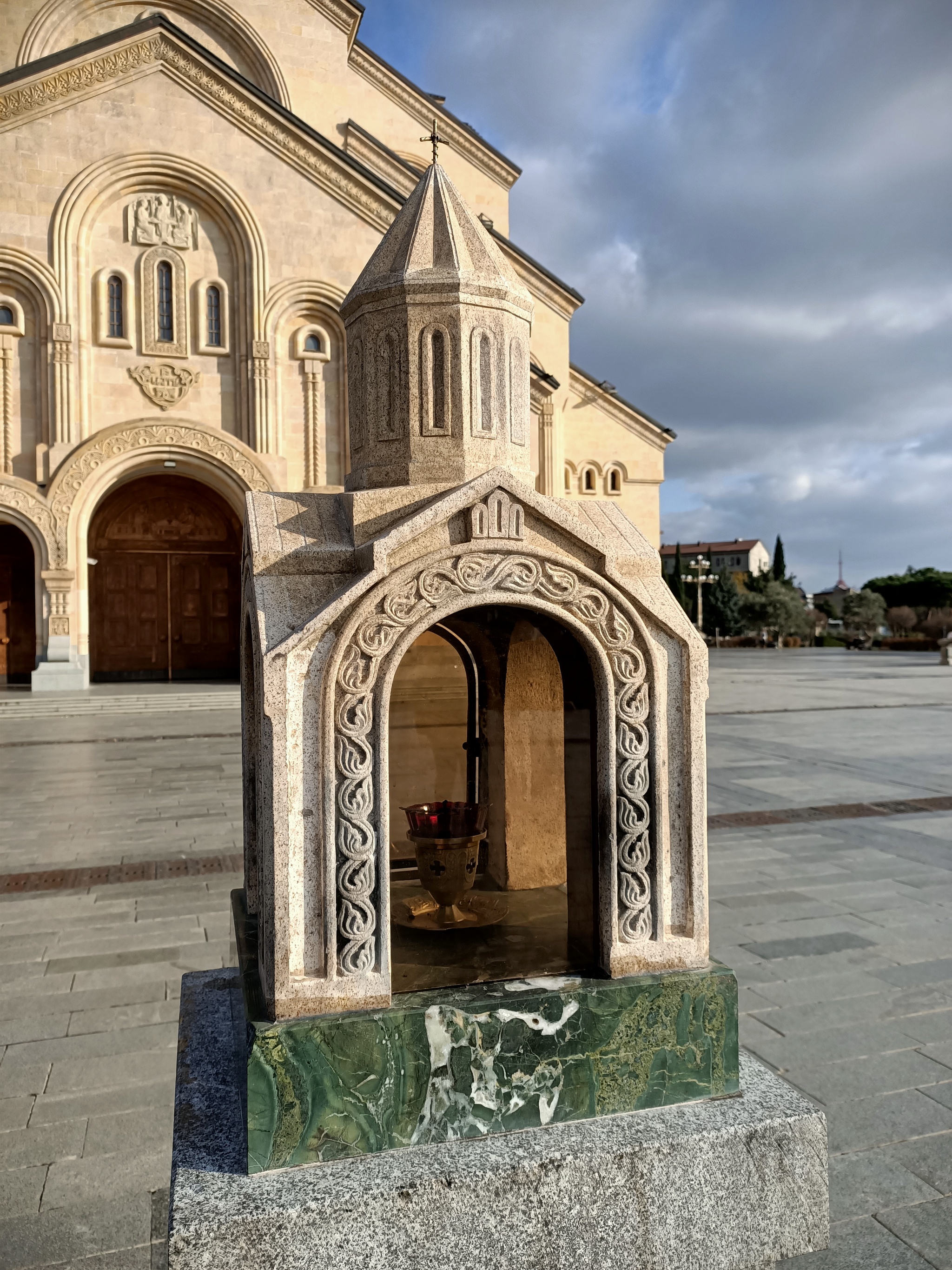 Была замечена интересная штука, в Тбилиси достаточно много религиозных людей, когда ещё с аэропорта на автобусе ехал заметил взрослую женщину которая крестится когда проезжали рядом с каким нибудь храмом. Так же просто когда гулял по улице то тоже встречались люди которые шли, шли, останавливались, перекрестились и шли дальше, причём это были не какие ни будь пожилые а достаточно молодые люди и даже школьники. Поэтому делаю вывод что в Грузии религию очень любят, храмов тоже тут много от достаточно больших до маленьких часовенек, а ещё театры любят судя по их количеству и выпечку потому что очень много не больших пекарней.
