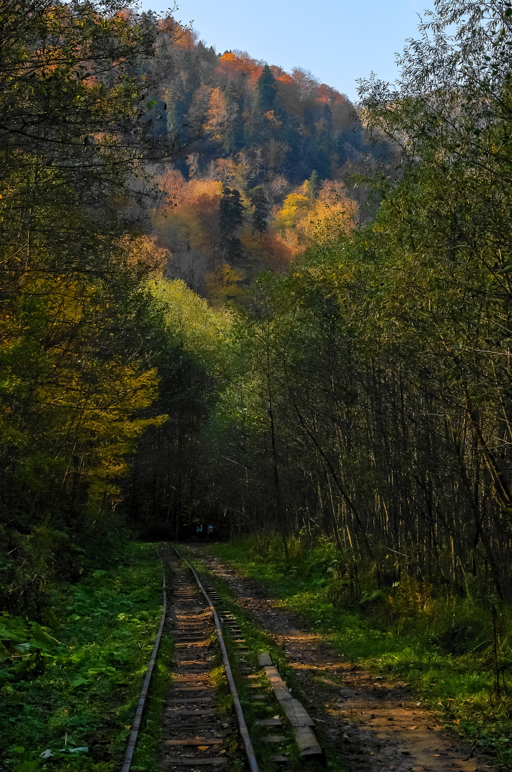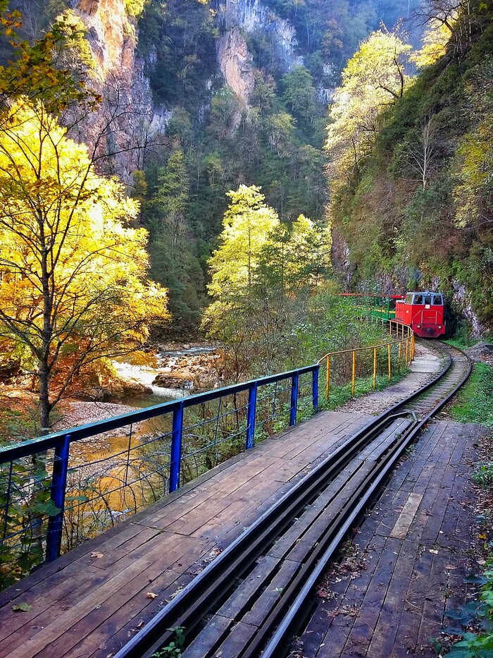 Вдоль ущелья проходит узкоколейная железная дорога. Раньше дорога использовалась для лесозаготовок. Сегодня по дороге курсирует экскурсионный "поезд" (тепловоз + пара вагонов). Так что по дну ущелья вдоль реки можно прокатиться и на поезде, и, при желании, пройти пешком. Правда, тепловозик идет примерно до середины ущелья (дальше путь перекрыт оползнем), а вот пешком можно пройти все ущелье и выйти в поселок Мезмай.