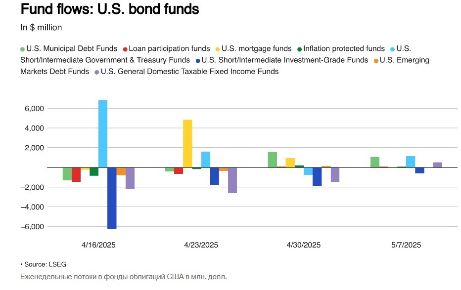 Краткосрочные и среднесрочные государственные и казначейские фонды увидели чистые покупки на сумму $1,15 млрд, что отменило чистые продажи на сумму $765 млн на предыдущей неделе. Муниципальные долговые фонды также увидели чистые добавления на сумму $1,06 млрд.