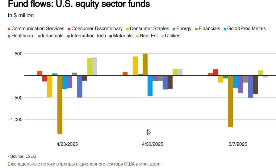Секторальные фонды США увидели чистую сумму продаж в размере $2,89 млрд. Инвесторы распродали бумаги финансовых, технологических, металлургических и горнодобывающих фондов на сумму $1,18 млрд, $507 млн и $420 млн соответственно.