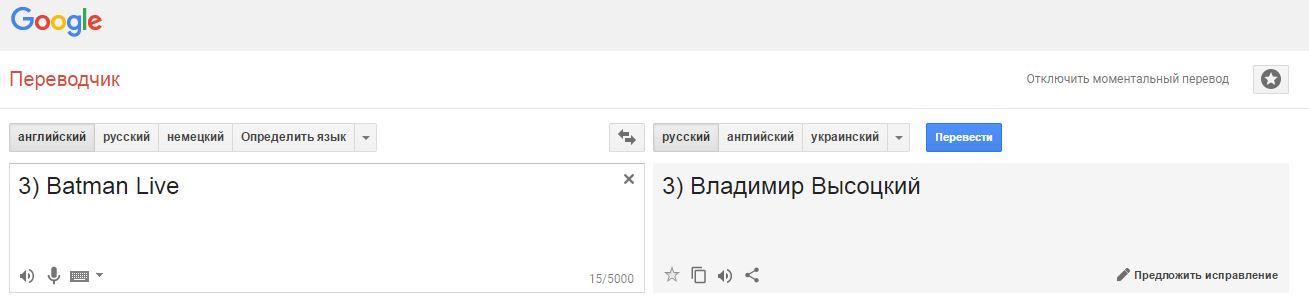 5 Lexximus Гугл ты чего? 8 лет назад Тот момент, когда перевод правильный знаешь, но решил проверить, чтобы убедиться.Лучше бы не проверял. Перевод Google Владимир Высоцкий Бэтмен