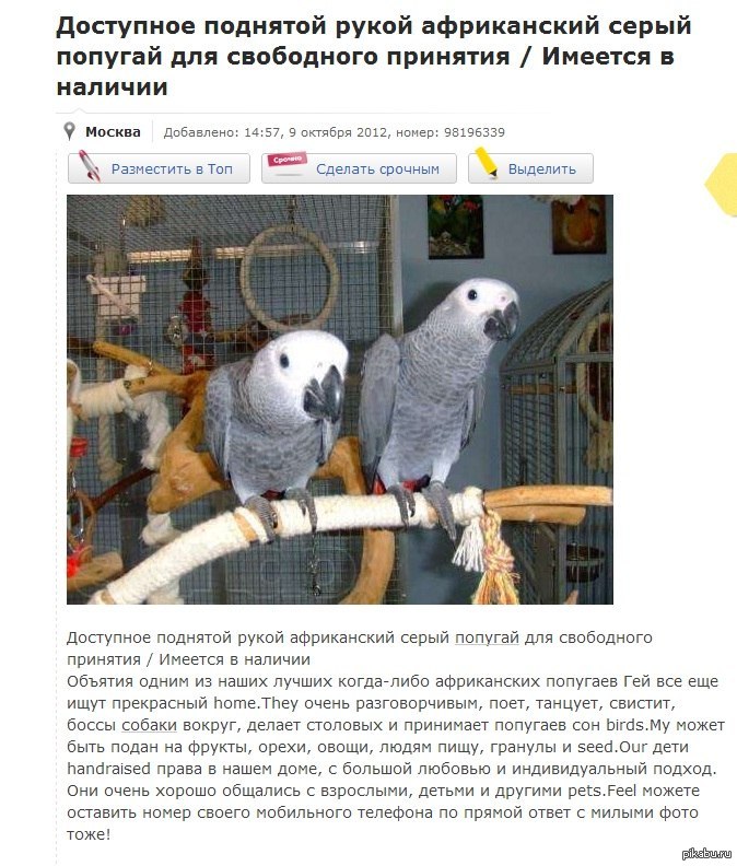 yeapyeap Гуглопереводчик или не совсем успешный маркетолог. 11 лет назад Хотел я как-то купить попугая и наткнулся на такое объявление. Баянометр молчит. [моё] Google Translate Попугай Жако Попугай гей