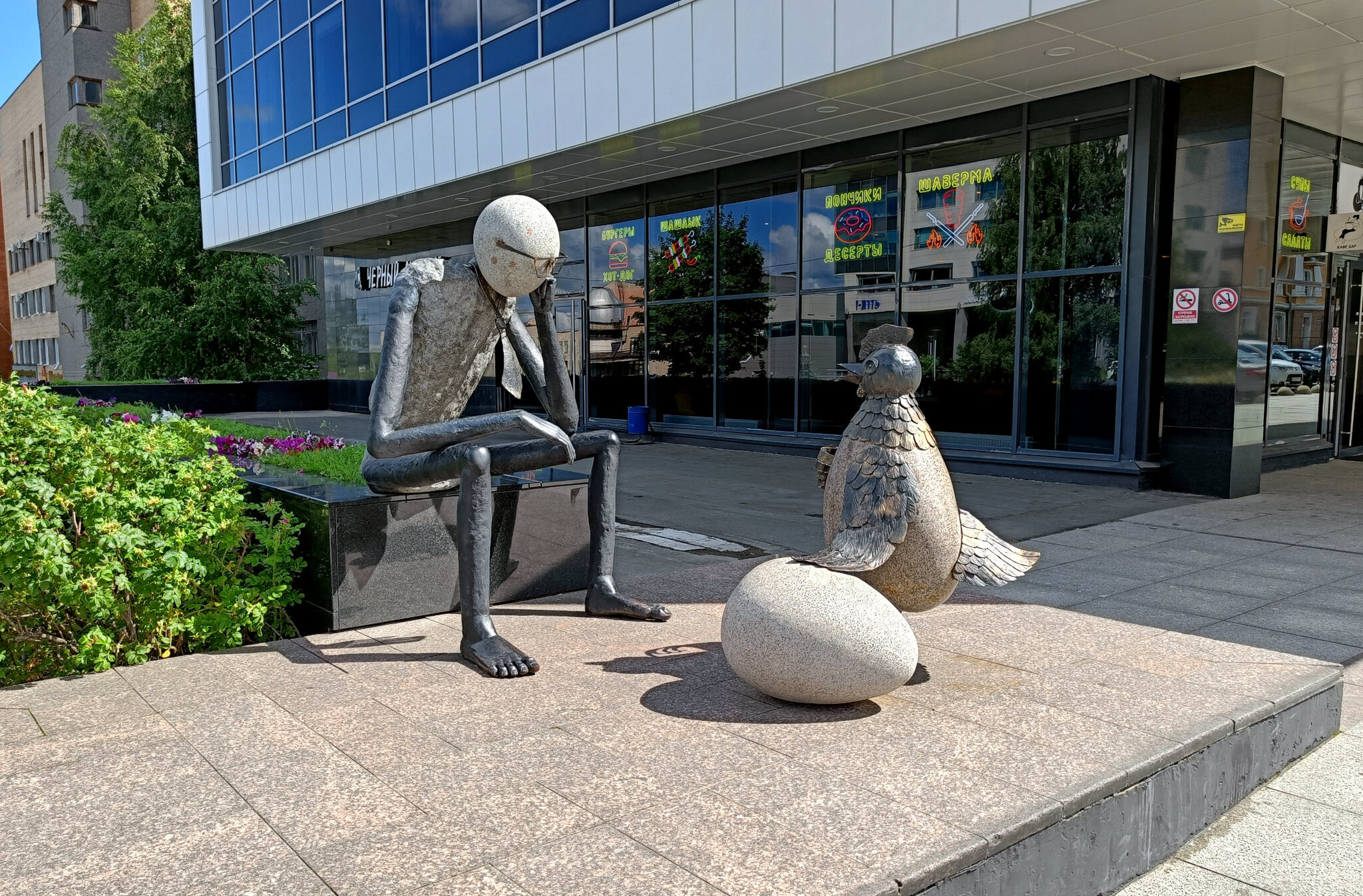 Не об этом ли размышляет расположившийся по другую сторону улицы яйцеголовый мужик в очках? Хотя вряд ли. Судя по названию памятника «Курица или яйцо?» он думает, что бы ему съесть на завтрак. Курица явно пытается уговорить его на яичницу вместо филе грудки.