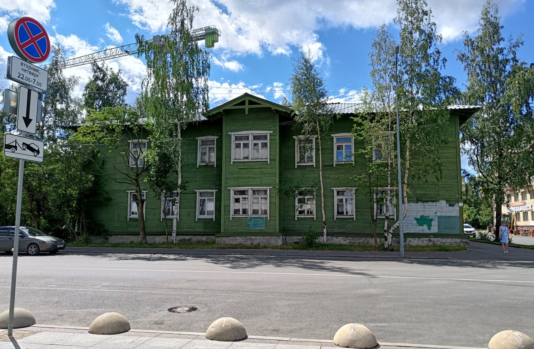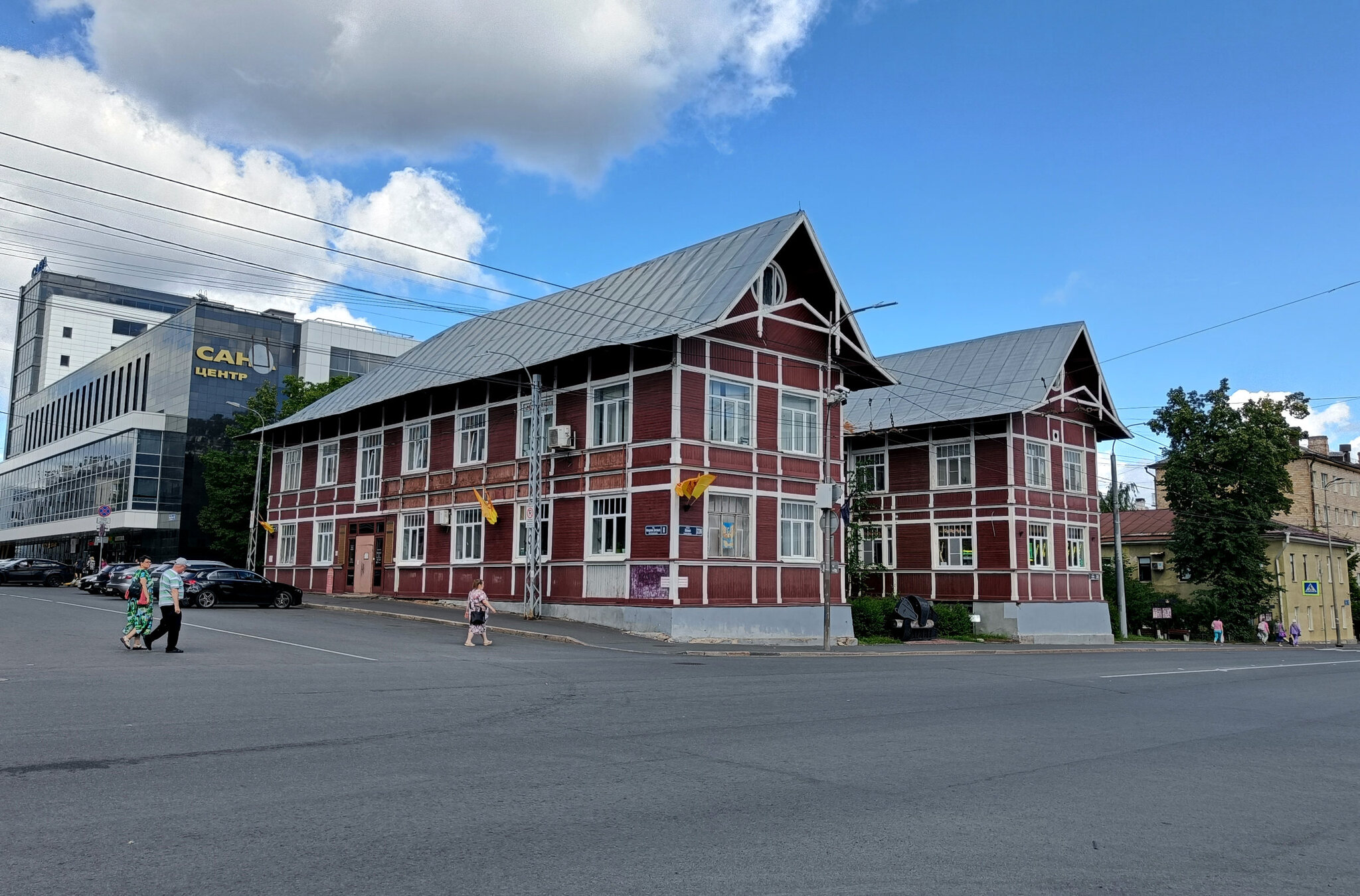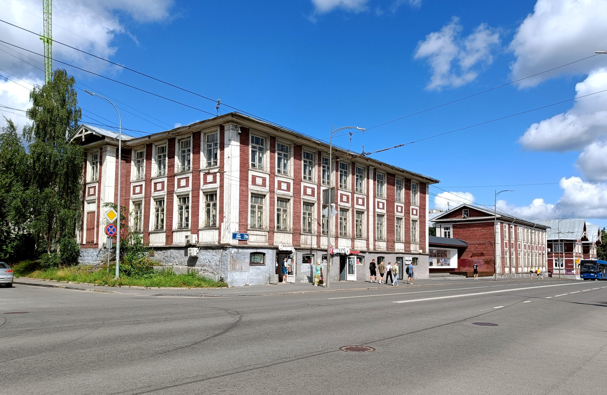 Административное здание треста «Кареллес» 1930-х годов вновь напоминает нам о стиле северного деревянного модерна. Только не перепутайте: здание, что на перекрёстке с улицей Анохина, – это «Карелдрев», а здесь был «Кареллес». Естественно, что эти организации строили себе дома из дерева, верно?