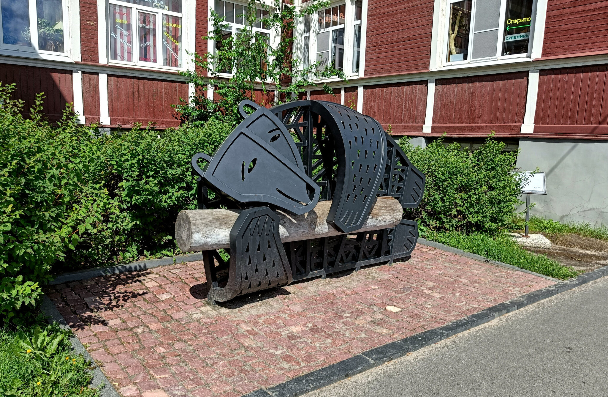 Перед зданием греется на солнышке местный карельский медведь. Это довольно новый памятник, 2020 года, от скульптора Владимира Зорина. Обычно арт-объект описывают так: мол, на гербе Карелии тоже есть медведь, это местный символ, но гербовый медведь какой-то слишком свирепый, а на самом деле он добрый. Особенно когда спит. В обнимку с бревном, ага.