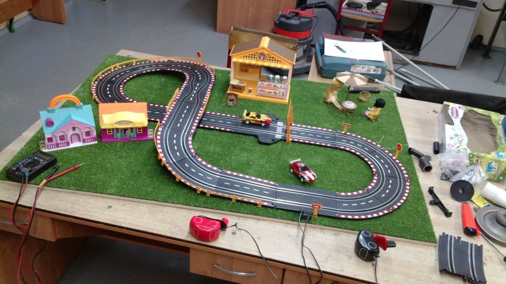 опущу предысторию. получилось так, что я занялся гуманитарной помощью для местной детской больницы. была у меня сборная трасса с машинками на рельсах, на электродвигателях. смысл в чем: крутишь ручку - машинка едет быстрее, перекрутил - машинка вылетела с трассы, достаточно веселая хрень. так вот взял я эту трассу, кое-какие девчачьи игрушки у знакомой, лист фанеры, клей и лист искусственной травы. приклеил траву на фанеру, а сверху трассу и пейзаж из девчачьих кукольных кафе и пляжных зонтиков, чтобы дети ничего не сломали. вышла неплохая такая композиция (выложу фото в комментарии(да, я тоже поиграл)).