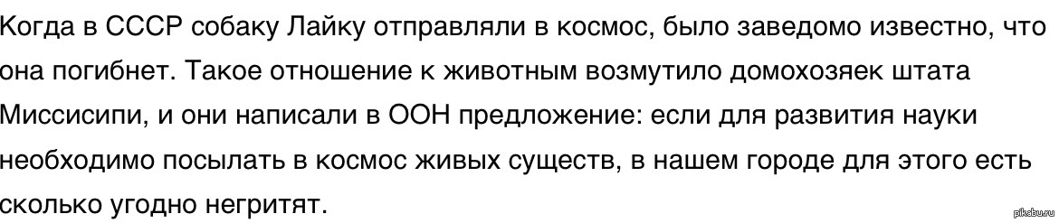 12 katisha74 Гуманность к животным и откровенный расизм 11 лет назад Нашла на просторах интернета Расизм Собака США СССР Текст Не мое