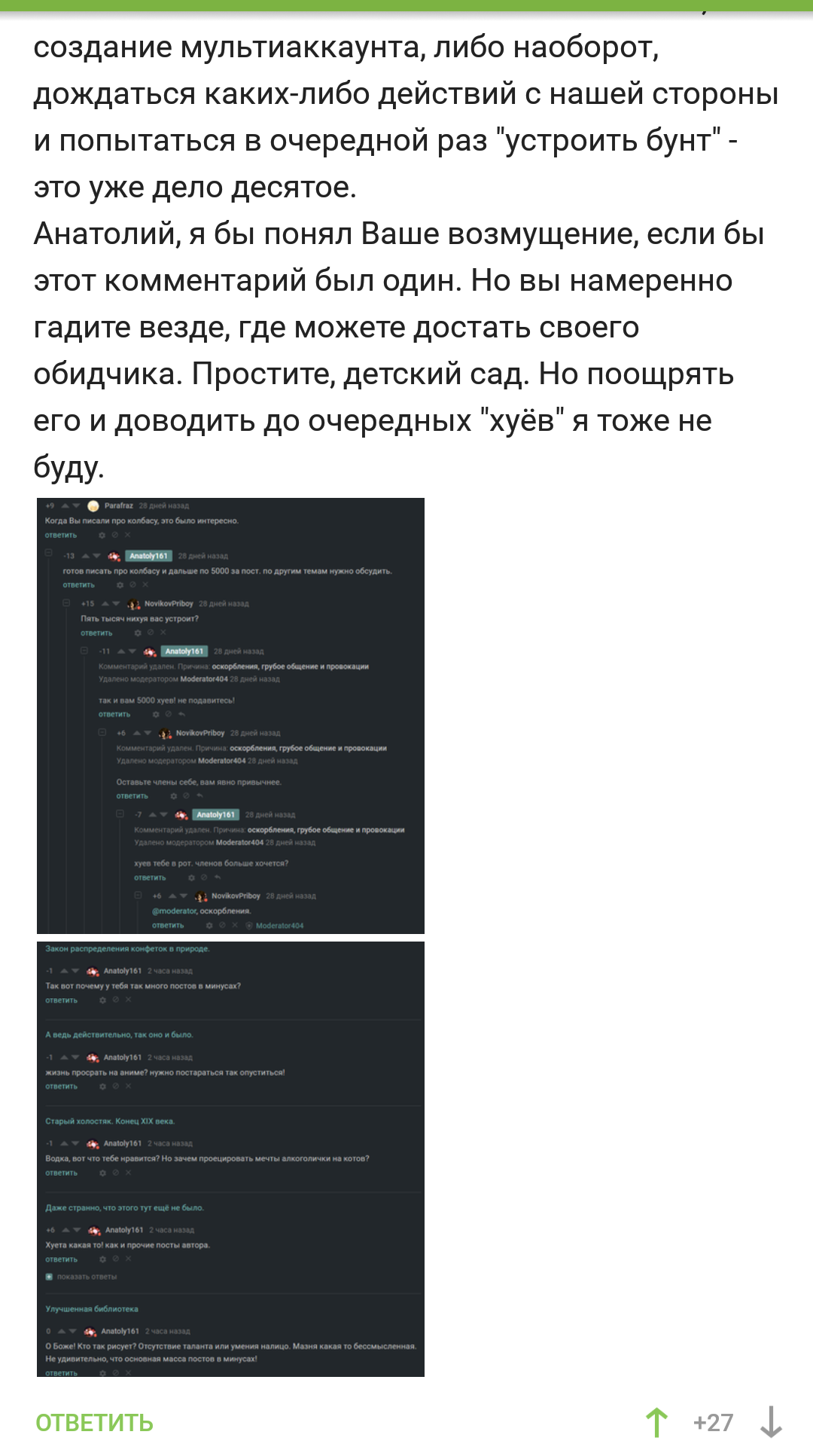 Если почитать посты данного пользователя, мы можем выяснить что ТС мужчина 37 лет, успешный бизнесмен и колбасных дел мастер занимается такой бесовщиной, что травит пользователя @NovikovPriboy,и если почитать её посты , да да Анатолий именно её , является молодой девушкой которая увлекается живописью и стар треком . Модератор не заставил себя долго ждать и четко расставил всё на свои места:#comment_151376471