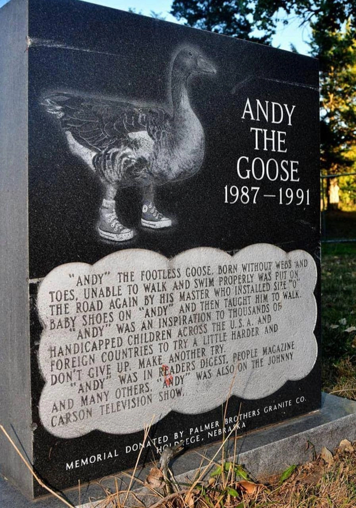 В Небраске есть надгробный памятник гусю Энди, который появился на свет в 1987 году без перепончатых лап.