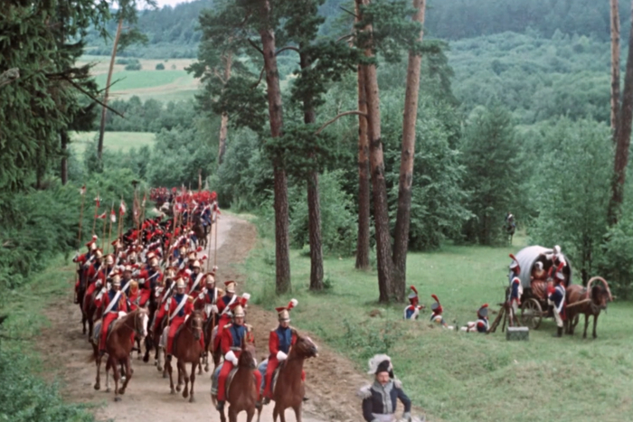Есть фильмы, которые выглядят, как праздничная открытка. В данном случае, это открытка к юбилею Бородинского сражения. Всё с иголочки: разноцветные мундиры, звенящие шпоры, пафосные (но чертовски искренние) речи о Родине и сотни марширующих статистов. И да, это открытка времён оттепели: лёгкая, пёстрая и радостная.