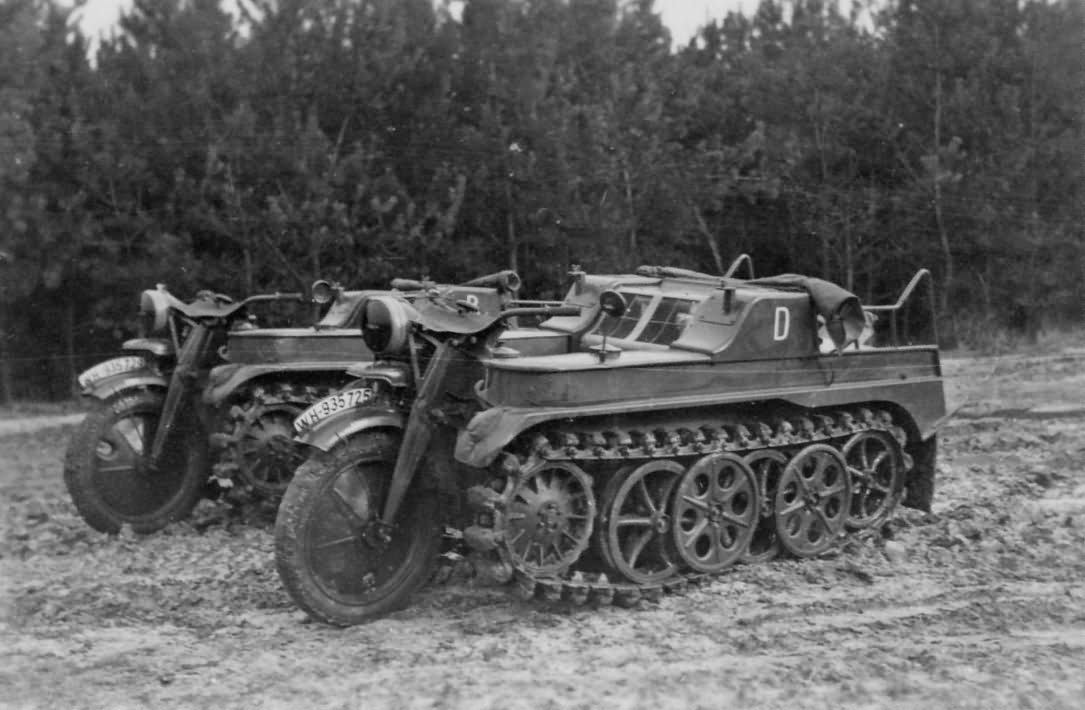 А Вермахт пошел дальше и разработал SdKfz 2, известный также, как Kettenkrad HK 101 - полугусеничный мотоцикл высокой проходимости, массово выпускавшийся в Германии в годы Второй мировой войны.