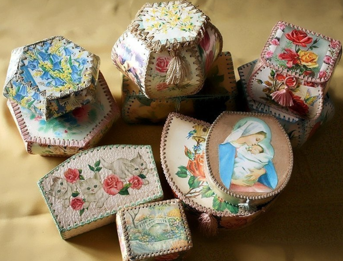 Уметь делать шкатулки из открыток считалось высшим пилотажем открыточного творчества. Для прочности открытки укрепляли картоном, затем вырезали по шаблону и сшивали вручную. Шкатулки получались довольно прочными и, конечно, были в единственном экземпляре!