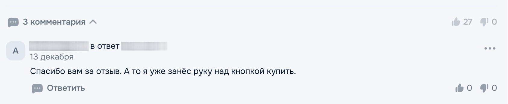На Озоне мой отзыв несколько раз распубликовывали, но он все-таки сумел собрать за полдня 27 лайков и ответы вроде