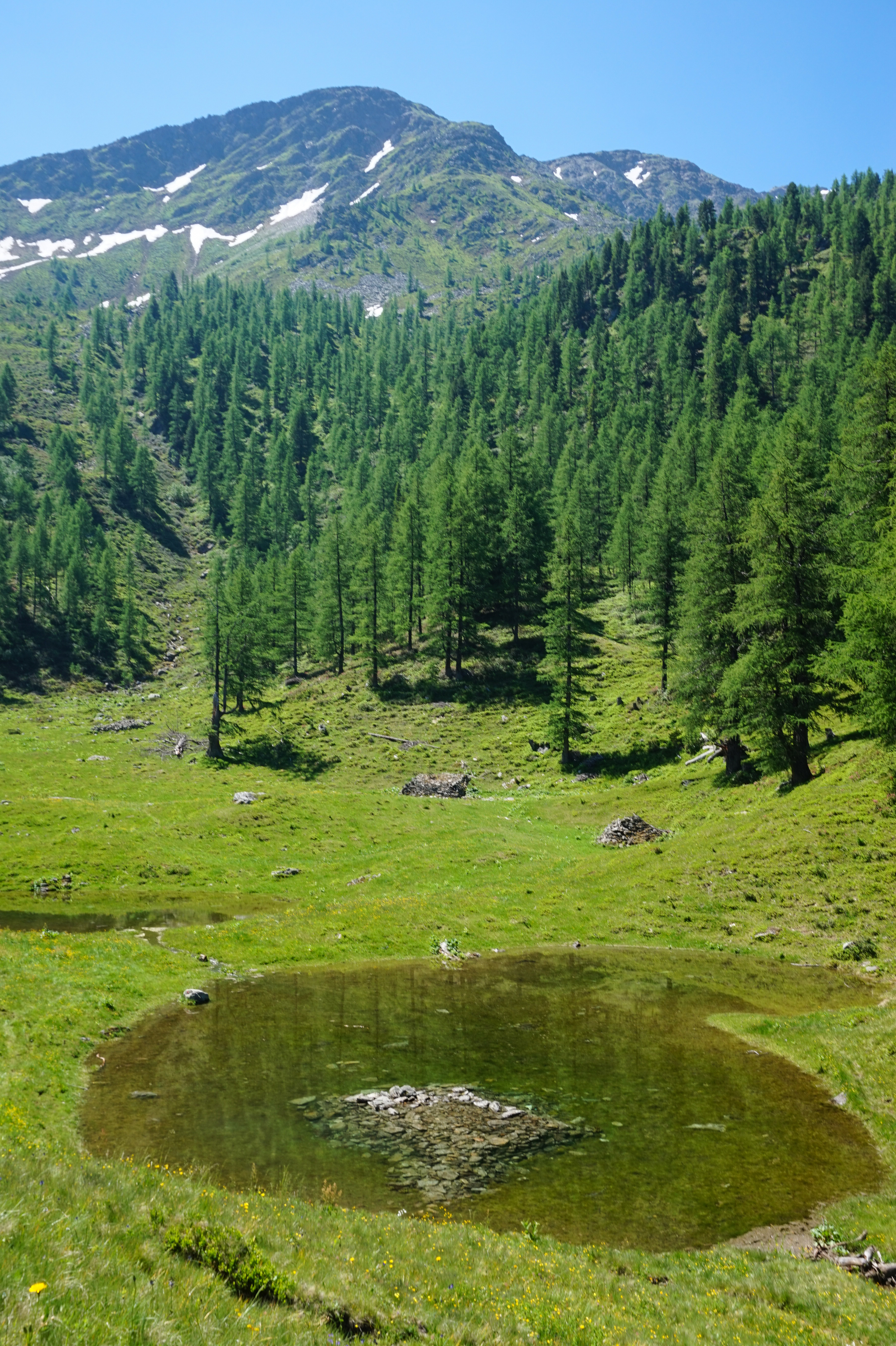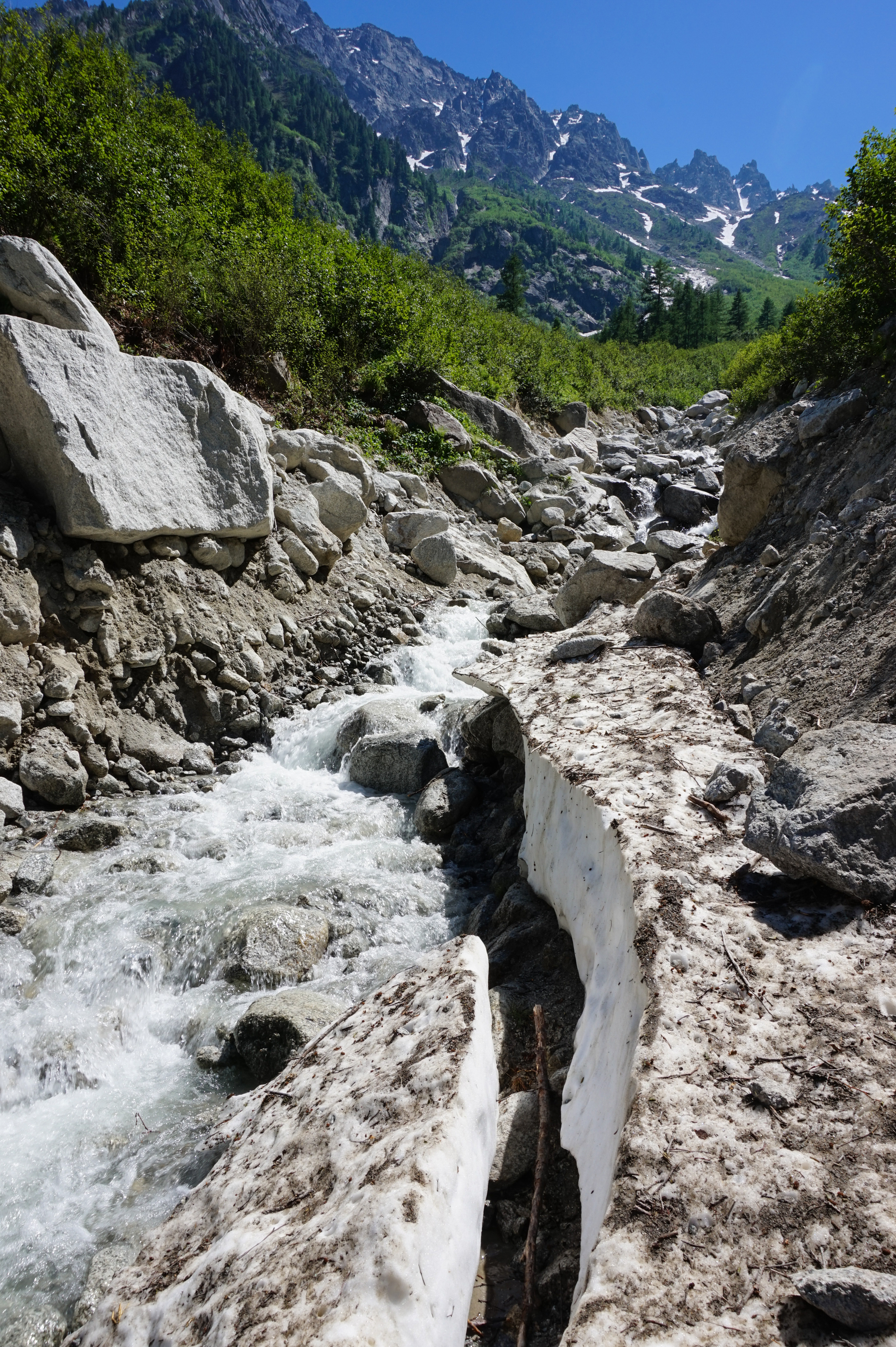 Встав и позавтракав начинаю спуск. сначала пытаюсь пройти по оффициальному маршруту, тропа уходит левее и траверзом по снежнику. но следов почти нет. но вроде норм, можно пройти. окуратно двигаюсь траверзом. вбиваю ноги в снег. склон становится все более вертикальным, а снег превращается в лед. В какойто момент говорю себе СТОП! Паша! Двинуть лысты в свое день рождение не лучшая идея! оккуратно разворачиваюсь и ползу обратно. на оттаявших камнях перевожу дух и спускаюсь вниз по снежнику. внизу из под снега бьет ручей! это самая вкусная вода!