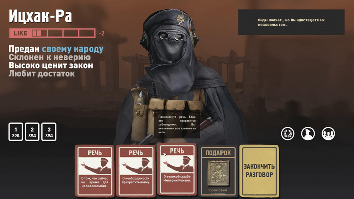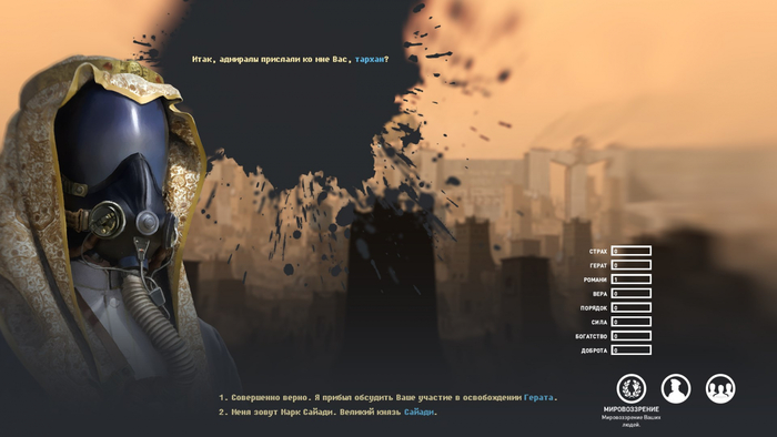 Еще в Highfleet есть ролевой элемент. У великого князя есть характеристики мировоззрения, отражающие его личную мораль и отношение к разным аспектам культуры Империи и Герата. Очки мировоззрения зарабатываются (и теряются) в некоторых действиях на глобальной карте, и, в основном, в диалогах с другими персонажами. У них, кстати, тоже есть свои предпочтения — их нужно учитывать в мини-игре по вербовке союзников.