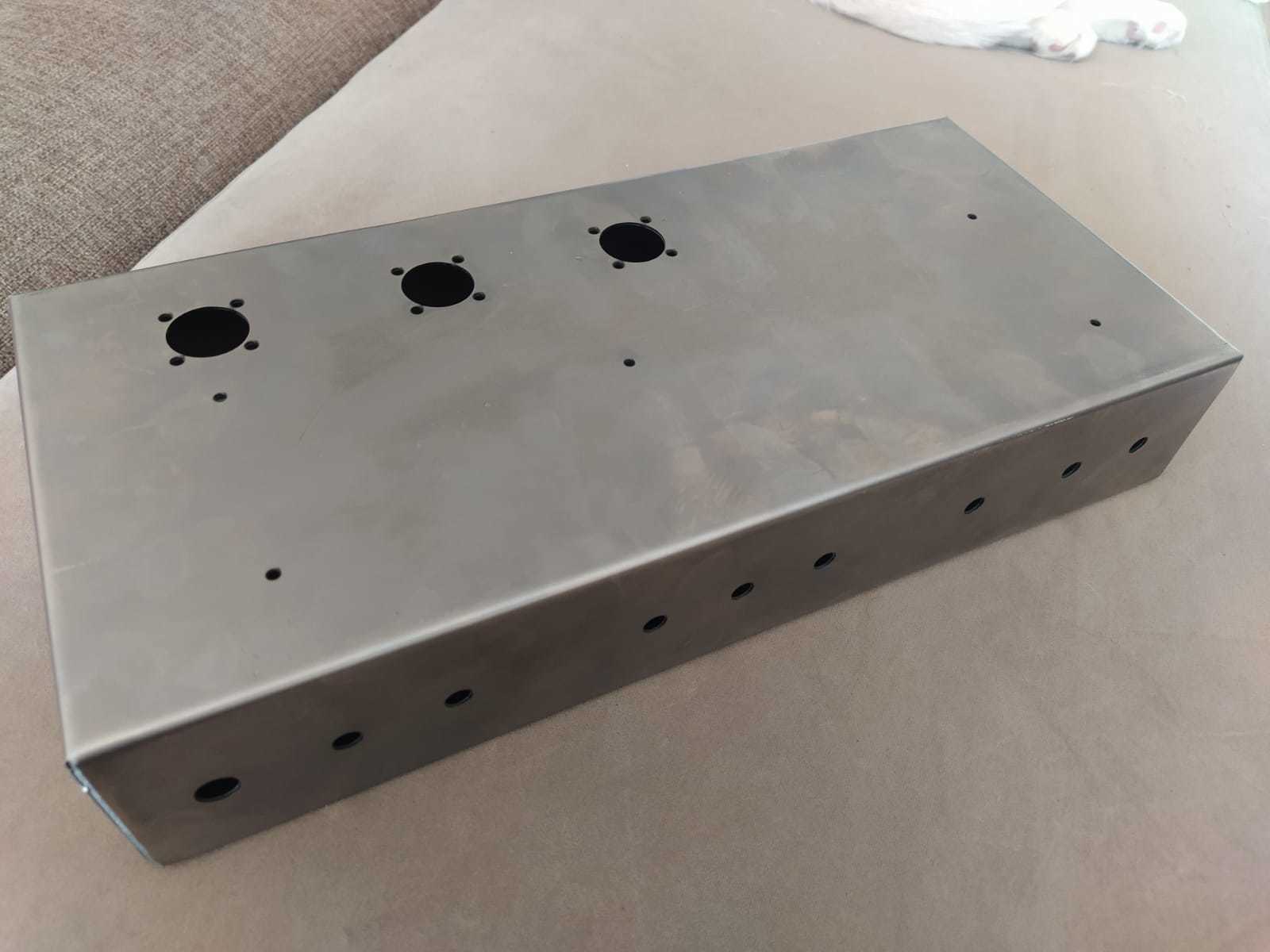 Сначала хотел собрать в шасси от дохлого Marshall MG15CD, но я промахнулся и разметил и рассверлил шасси зеркально. Нарисовал новое шасси под комбарь в Autodesk Inventor