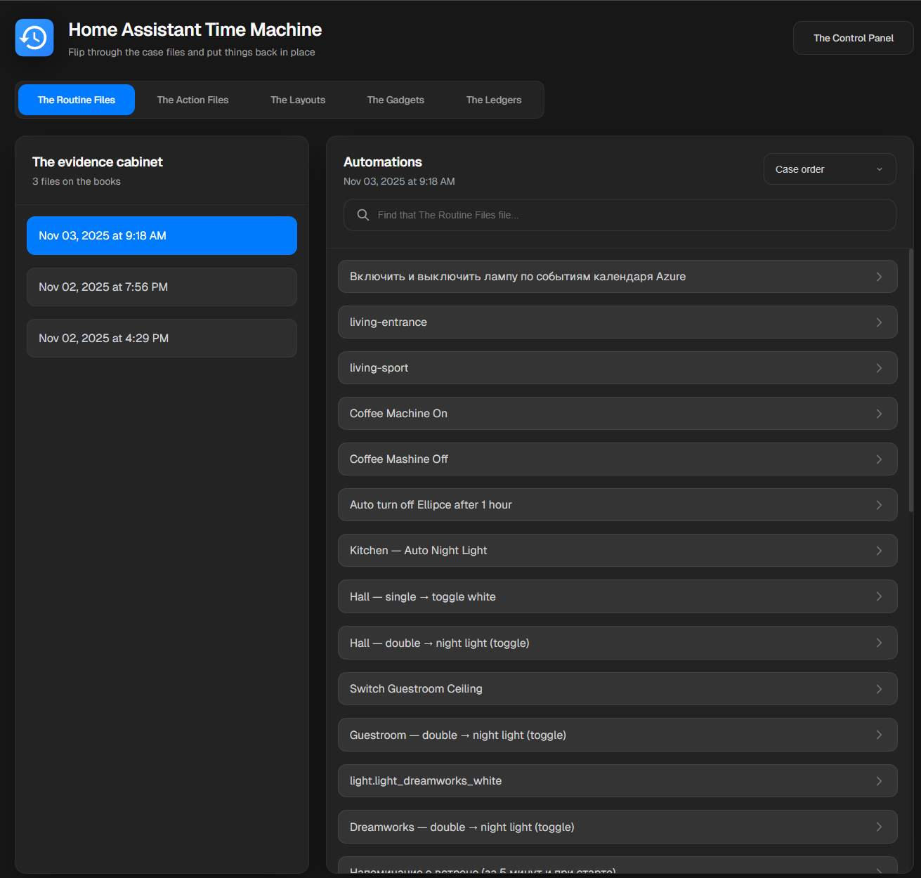 Этот модуль записывает историю изменений ваших YAML-файлов и конфигурации. Представьте: обновили аддон — и весь интерфейс посыпался. А Time Machine просто говорит: