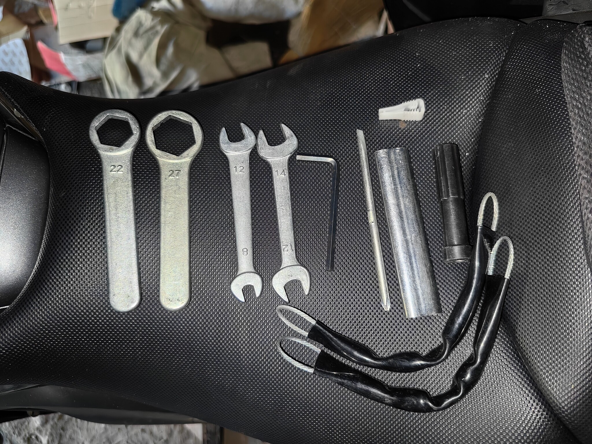 Оригинальный набор инструмента. Да, ключей там немного, а шестигранник вообще только один, но там есть 2 очень удобных ключа с переходником для снятия заднего колеса. А в дороге это очень важно, чтобы натянуть цепь, например. И не нужно возить с собой огромные «головки» или большие ключи.