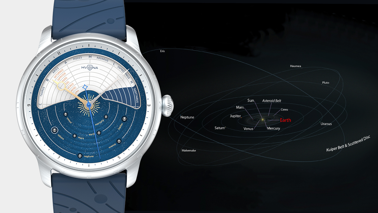 В нижней части циферблата расположена трехмерная модель планетария, отражающая современное видение устройства Вселенной. Стилизованные объемные планеты Солнечной системы, возвышающиеся над циферблатом, но не нависающие над ним, визуально находятся словно внутри космического пространства, погружая в атмосферу космической гармонии. Динамике всей композиции добавляет графическое изображение орбит движения планет, отдельным графическим элементом выделены кольца Сатурна. Циферблат выполнен в технике гильоше, что придает ему дополнительную глубину за счет рельефной поверхности.