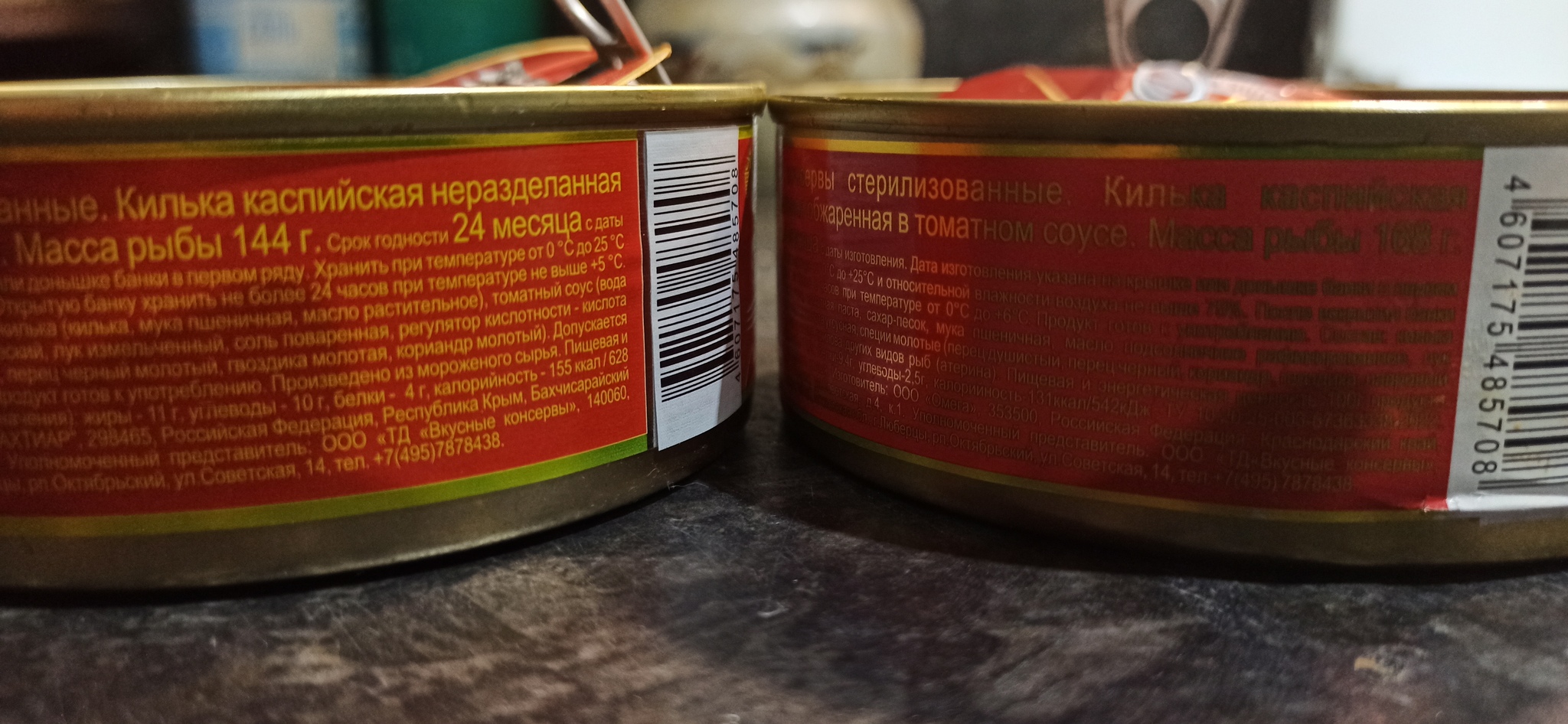 Иногда беру кильку в томатном соусе и вот вчера взял последние две банки (в КБ не реклама).Открыл одну,начал хомячить и краем глаза заметил что вторая банка как то отличается от первой.На первой банке крышка с надписями на картонке вставленная поверх крышки,а во второй банке на крышке рисунок набит на саму крышку.Ну и естественно решил изучить данные образцы.И что мы видим,шрикинфляция добралась и до сюда.Было и так мало рыбы 168гр,а стало ещё меньше 144гр.
