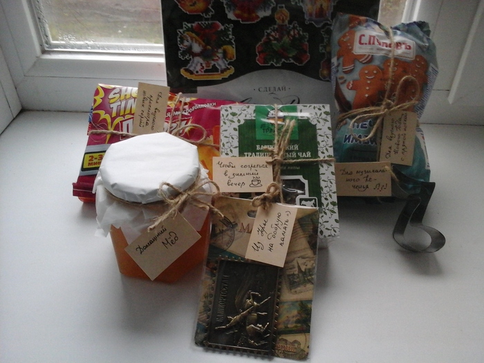 Вот мои новогодние сувениры. Настоящий, домашний мед от моей Снегурочки, прикольная формочка для выпечки в форме восьмой,чай-травяной чай ( с матрешкой, очень надеюсь, что не настоящей ХD))),попкорн для сериальчиков, магнитик (все, уже на холодильнике) и вышивочка любимая крестом.