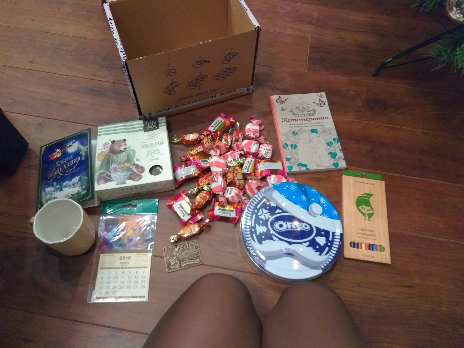 Ого, вкусный чай, календарь-магнитик с собакой, конфетки (просто обожаю Лёвушку), печеньки Oreo, карандашики и раскраска для взрослых с котами, ммм, будет чем заняться на праздничных выходных=)