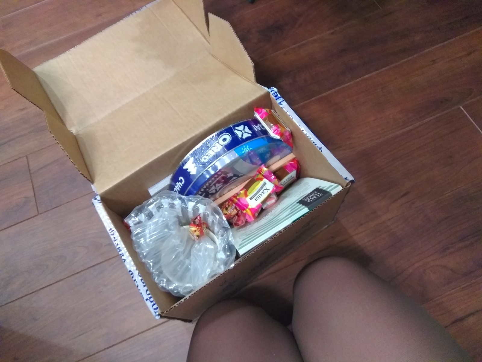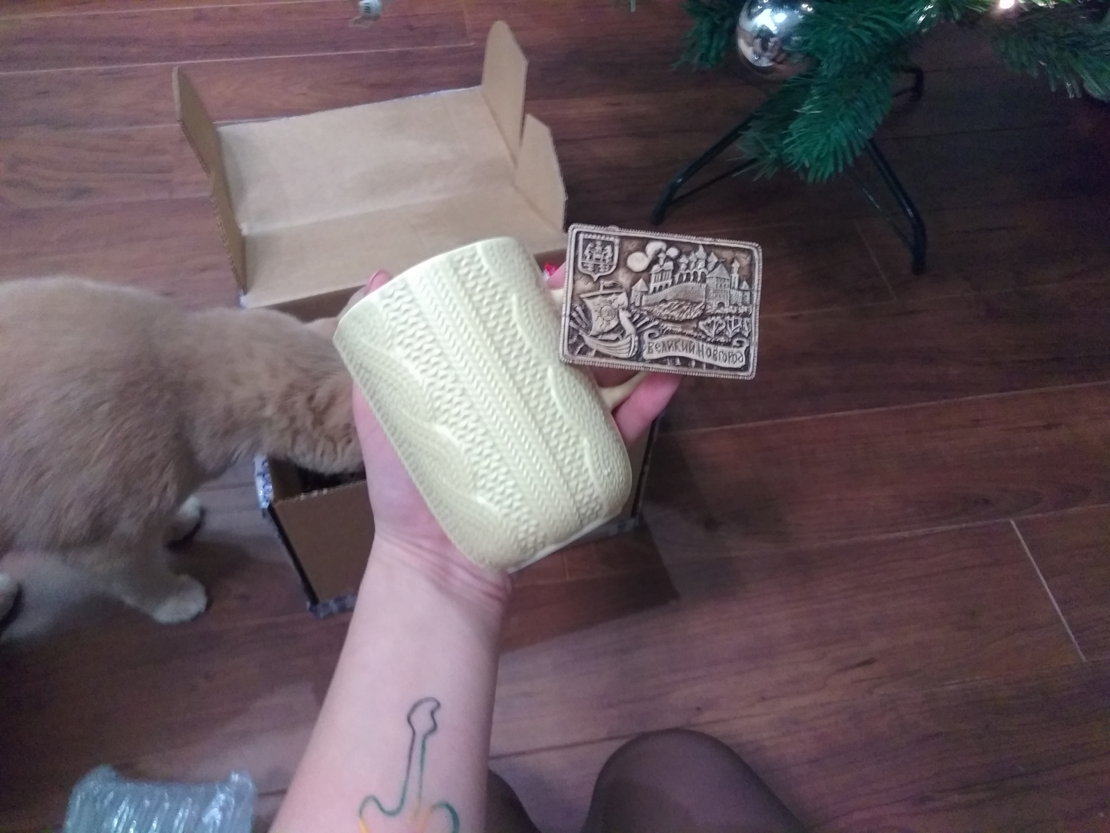 При вскрытии обнаружено большое количество конфет и печеньки, кружка в воздушной упаковке (в целости дошла) и магнитик=)