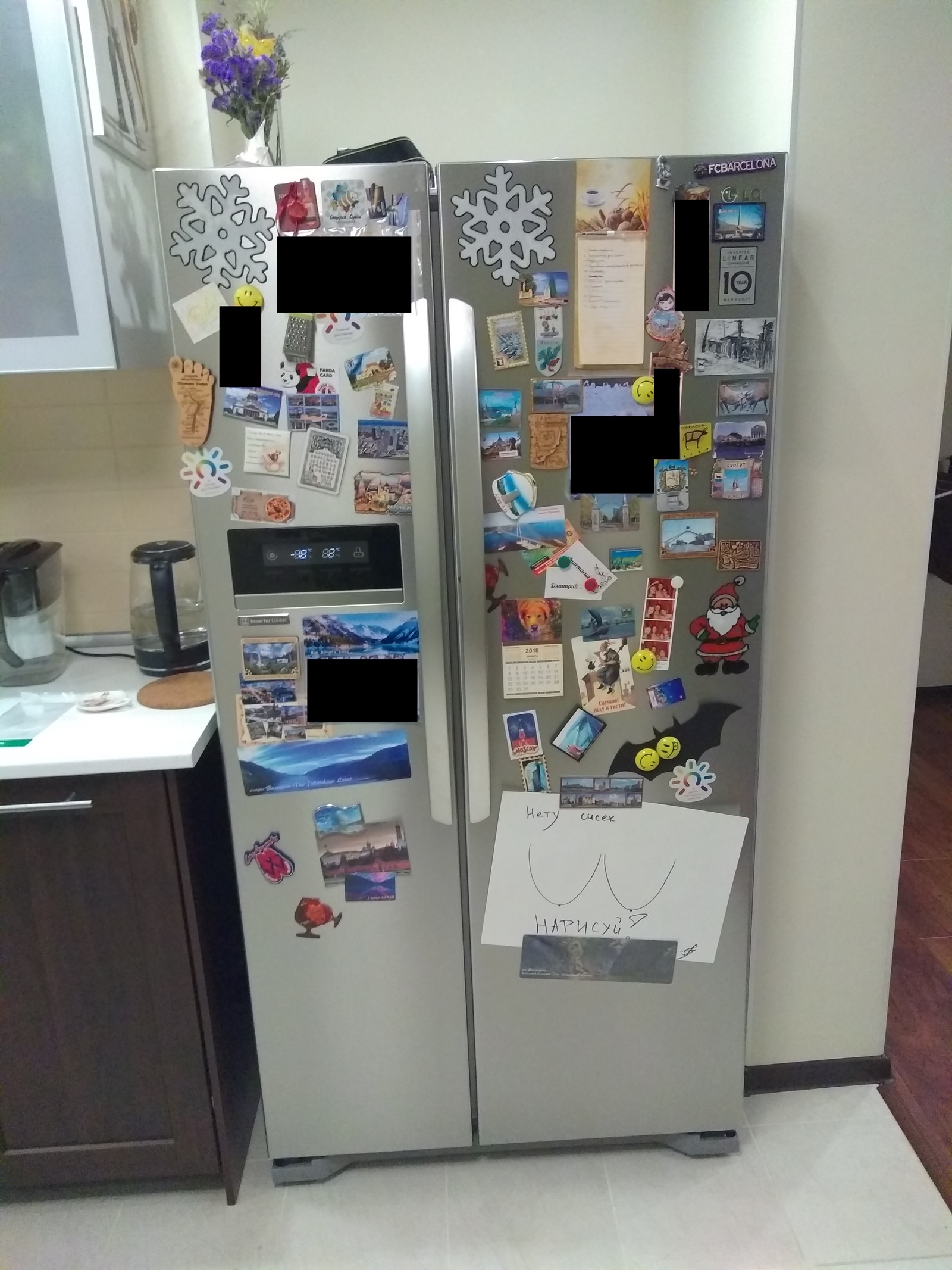 Магнитик (справа над санта-клаусом) и календарик с собакой (над магнитиком Москвы) заняли почетное место на холодильнике рядом с множеством других.