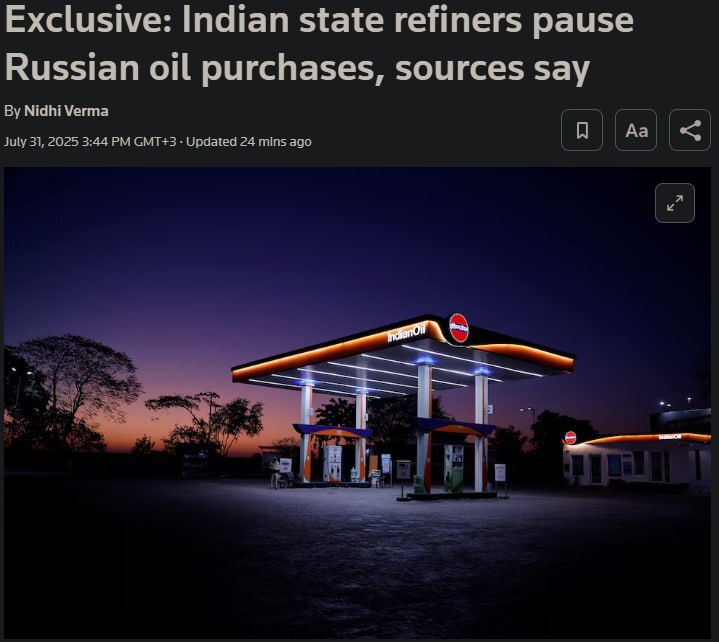 ⚡️Индийские государственные нефтеперерабатывающие заводы прекратили закупку российской нефти на прошлой неделе, — Reuters.