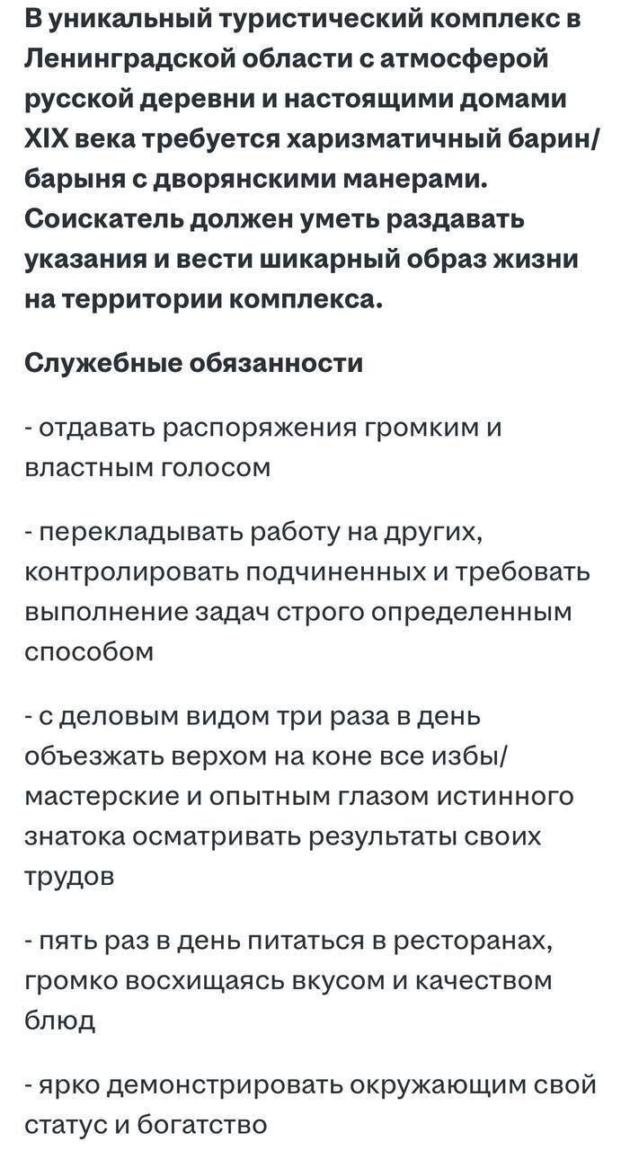 В Ленинградской области открылась необычная вакансия. В туристическом комплексе «Удивительная деревня Мандроги» ищут человека на должность барина или барыни с ежемесячной оплатой труда в 300 тысяч рублей.