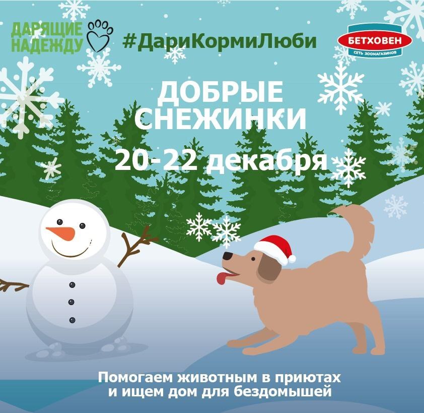 Фонд Дарящие надежду традиционно проводит предновогоднюю акцию #ДариКормиЛюби! с поэтическим названием «Добрые снежинки» для 43 приютов и волонтёрских сообществ в сети зоомагазинов Бетховен с 20 по 22 декабря 2024 года.