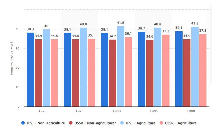 Советские граждане трудились в среднем на 4 часа меньше, чем американские. Особенно заметен разрыв в сельхоз отрасли в 1970 г. где в СССР работали на 5.2 часа меньше в неделю.