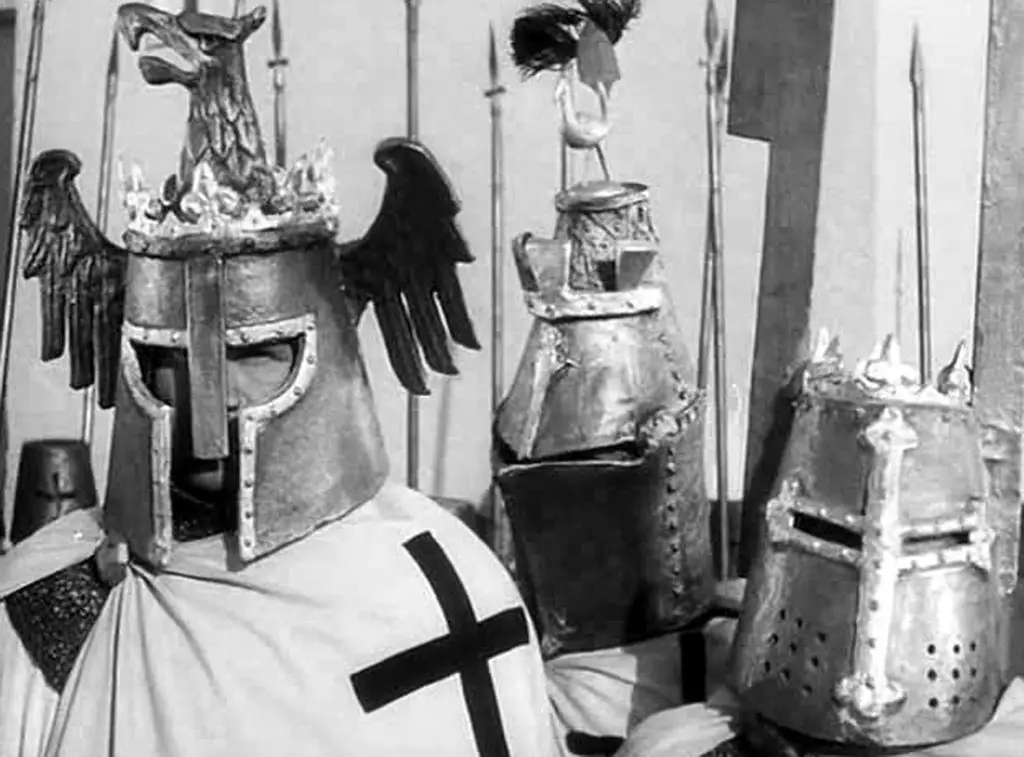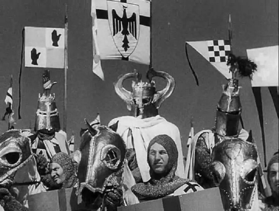 И невдомек было подавляющему большинству наших граждан, что не только тевтонским «Божьим рыцарям», но и вообще рыцарям военно-монашеских Орденов по Уставу запрещалось носить на шлемах любые украшения – ни рогов, ни крыльев, ни человеческих рук, ни орлиных когтей быть на них не должно было. Но так ведь рогов Сергею Эйзенштейну показалось мало! И на шлем предводителю рыцарей – ливонскому магистру (хотя настоящий магистр в той войне не участвовал!) он водрузил весьма замысловатое украшение – помимо рогов, еще и королевскую корону (!), увенчанную крестом, что никоим образом не подходило к его монашескому (а отнюдь не королевскому!) сану! Так что в итоге получилось весьма эпическое, но очень далекое от исторических реалий зрелище.