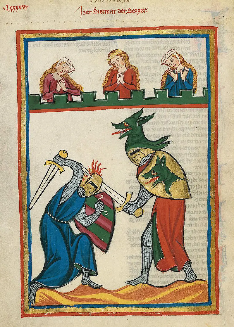 Миннезингер Дитмар дер Сетцер с зеленой волчьей головой на шлеме. «Манесский кодекс». Библиотека Гейдельбергского университета