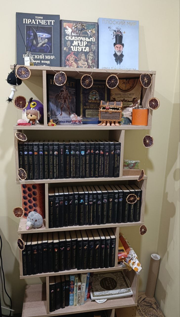 Пошла волна с книжными полками? Позвольте показать полное собрание сочинений Сэра Терри Пратчетта о Плоском мире в черной серии. Также тут его книги вне данного цикла. Ну и есть один импостер. ;)