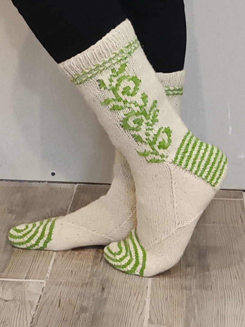 Несколько необычна общая конструкция - носочки рассчитаны как бы на ногу на цыпочках. Поэтому шов соединения верха и низа стопы смещается на верхнюю сторону, над пальцами. Я мерила, неудобства это не вызывает, только непривычно визуально.