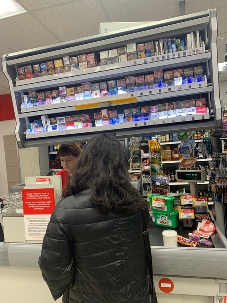 Стою сегодня в очереди на кассу в магазине, передо мной симпатичная девушка невысокого роста готовится оплачивать товар и хочет ещё купить сигарет, а они находятся в витрине над кассой. Примерно так, как на фото, только стеллаж повыше (5 ярусов) и поуже.