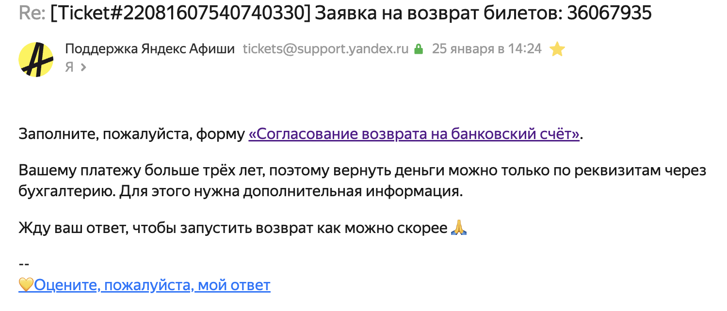История: В мае 2021 года приобрел с женой билеты на концерт группы Uriah Heep, который должен был пройти в апреле 2022 года. Сначала из за ковида, а потом после смерти одного из участников группы концерт был отменен. Разумеется я сразу написал в техподдержку Яндекс афиши, с просьбой вернуть денежные средства за билеты. Они начали отмазываться, что мол мы вернуть не можем, потому что нам не вернул средства организатор. И раз в пол года я им писал, в надежде наконец то вернуть свои средства, но ответ был всегда один. Но тут на днях, мне пришло письмо от яндекса, с просьбой заполнить форму для возврата средств. Я успешно заполнил все, что требовалось, и номера карт, банковских всех реквизитов и т.д., приложил необходимые сканы и подписанное собственноручно заявление.